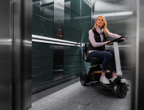 Appartement, smalle gangen: powerchair met kleine draaicirkel + slimme toegang.