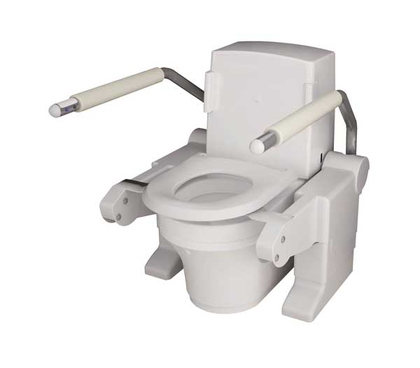 Toiletlift. Ondersteunt gecontroleerd zitten en opstaan. Er zijn varianten met meer “sta-op”-hulp of juist meer verticale ondersteuning.